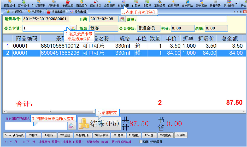第9步:前臺(tái)收銀,對(duì)會(huì)員的零售可用前臺(tái)收銀,收銀和客戶的銷售出庫(kù)是完全兩個(gè)獨(dú)立的模塊,會(huì)員只能收現(xiàn)金不能用于欠款銷售,并不能修改已收銀過(guò)的單據(jù),只能做廢,直接點(diǎn)擊工具欄上前臺(tái)收銀按鈕打開(kāi)如圖所示的窗口