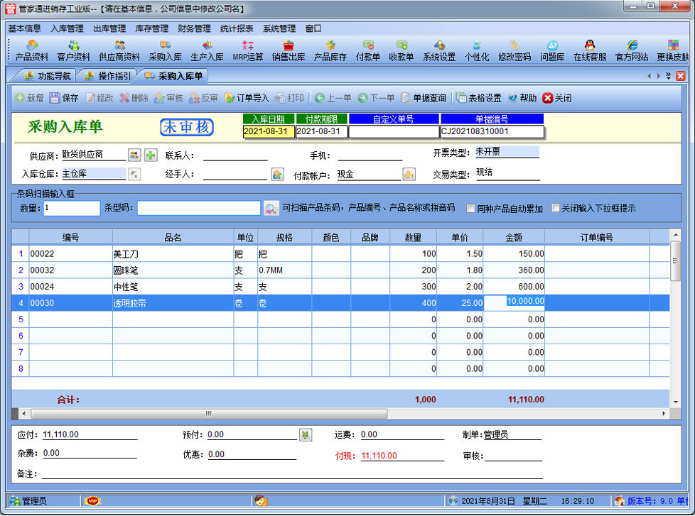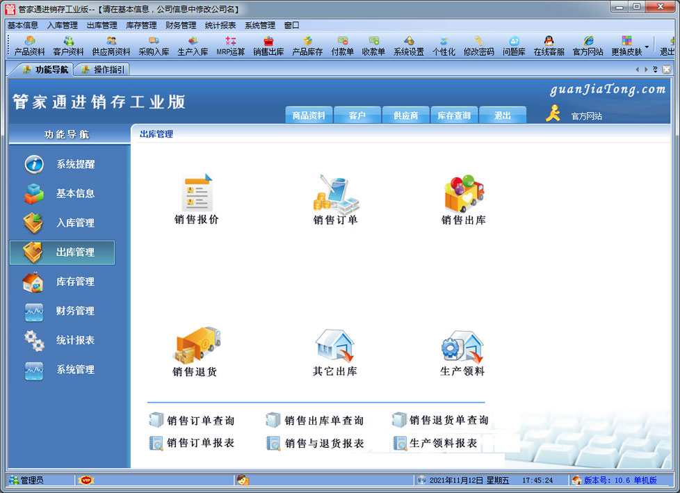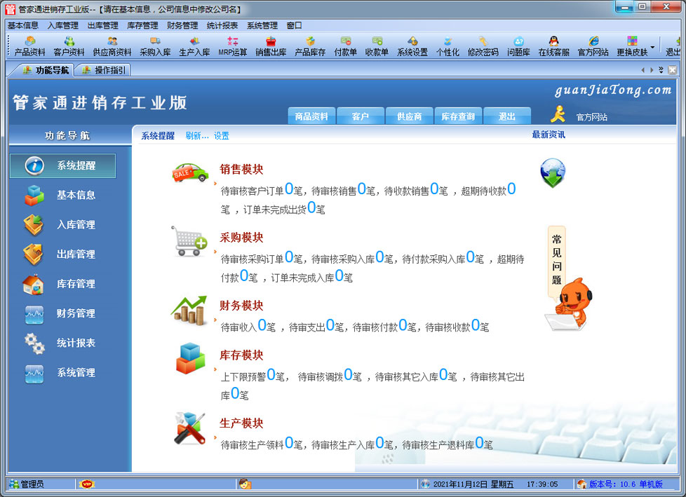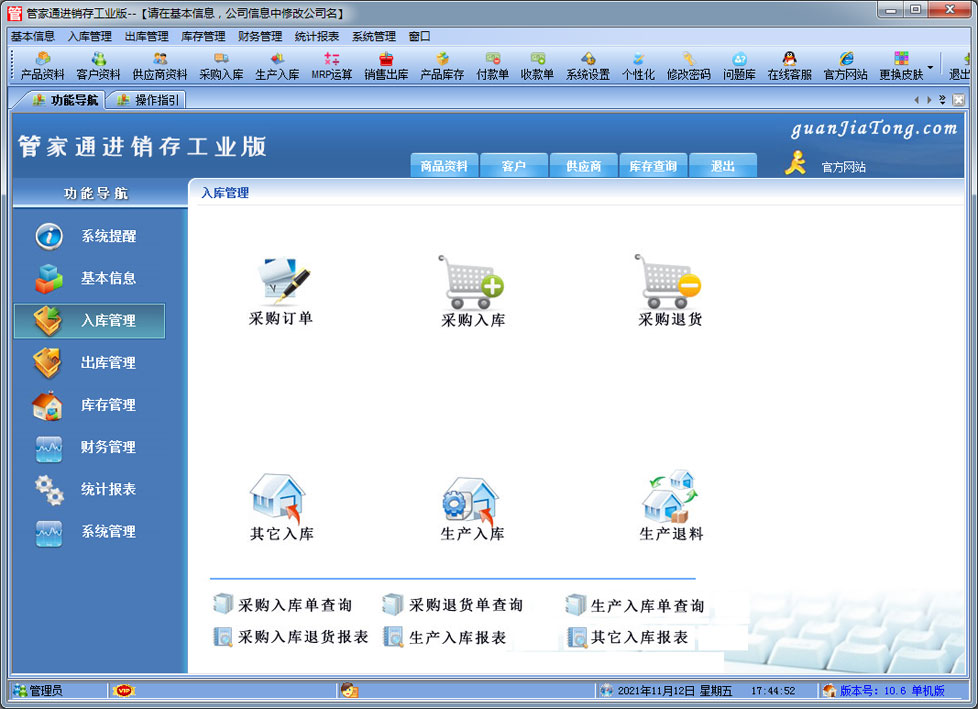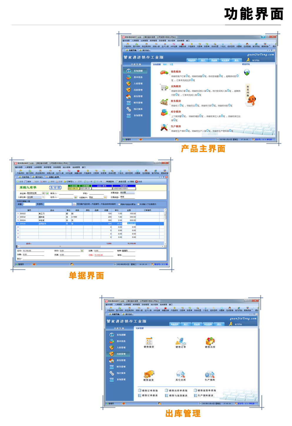 管家通進銷存工業(yè)版是一款專業(yè)的生產制造企業(yè)的進銷存管理軟件,可對成品的BOM設置,客戶訂單下達后根據(jù)BOM進行MRP物料需求運算。其中包含產品銷售管理系統(tǒng) ,庫存管理系統(tǒng)(倉庫管理系統(tǒng)),財務和報表系統(tǒng)等子模塊。軟件界面設計簡潔,美觀,其人性化的軟件流程,使普通用戶不需培訓也能很快掌握軟件操作使用方法,上手極易。強大報表與集成查詢功能是本軟件的最大特色,所有功能在用戶需要的使用地方自然體現(xiàn),不用打開多個窗口重復查詢。管家通進銷存軟件廣泛適用于企業(yè),商貿公司,個體門店等用于商業(yè)銷售管理, 庫存管理,財務管理等,客戶管理,員工管理等場合,是您企業(yè)進行信息化管理的強大工具。 入庫管理:進行產品采購入庫,采購退貨,采購入庫,委外加工入庫。 出庫管理:銷售訂單,銷售出庫,客戶退貨,MRP物料需求運算,委外加工發(fā)料。 庫存管理:包括庫存之間貨品調拔,庫存報損、報溢,庫存盤點功能。 財務管理:預付款、預收款,應收應付款,收入支出,,供應商往來帳務,供應商付款,客戶往來帳務,客戶付款 。 統(tǒng)計報表:完整的統(tǒng)計查詢功能,每張單據(jù)每次業(yè)務金額都可以清楚的反映。 權限管理:可添加刪除系統(tǒng)操作員帳號,強大的權限控制,可以設置某用戶對某窗口某個按鈕的權限。 打印設計:可對系統(tǒng)內每個單據(jù)進行打印的格式設計,可以導出,導入,每個操作員可設計自己的打印格式。 界面設計:系統(tǒng)窗口界面名稱可以自定義設計,表格的顯示順序,寬度,是否顯示等,每個操作員可以設計自己的界面。 系統(tǒng)設置:可以靈活設置系統(tǒng)小數(shù)位數(shù),可選0-6位,讓帳務更精確,可對以往數(shù)據(jù)進行選擇性的清除,以便系統(tǒng)初始化。 數(shù)據(jù)備份:可隨時對系統(tǒng)數(shù)據(jù)庫進行安全備份,以防數(shù)據(jù)丟失。 |